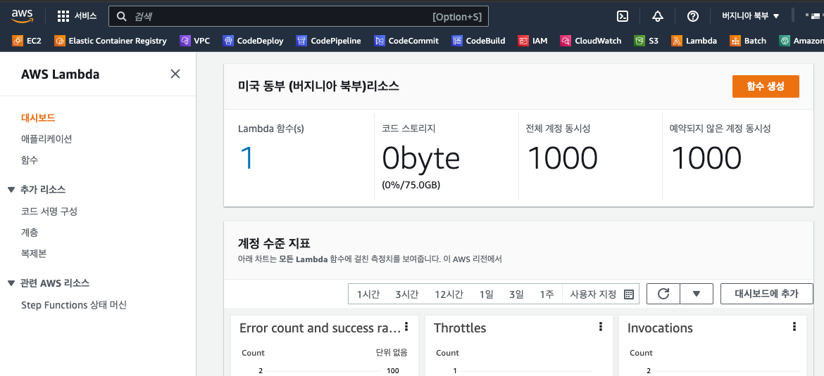 AWS Lambda 서비스 화면에서 함수생성 버튼을 클릭합니다.