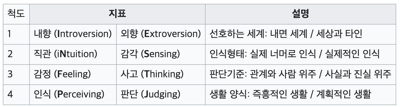 한 사람에 대해서 각 척도별로 두 지표중 어느 쪽에 더 가까운지를 정할 수 있고, 이렇게 정해진 4가지의 지표 특성을 조합하여 한 개인의 성격 유형이 된다.