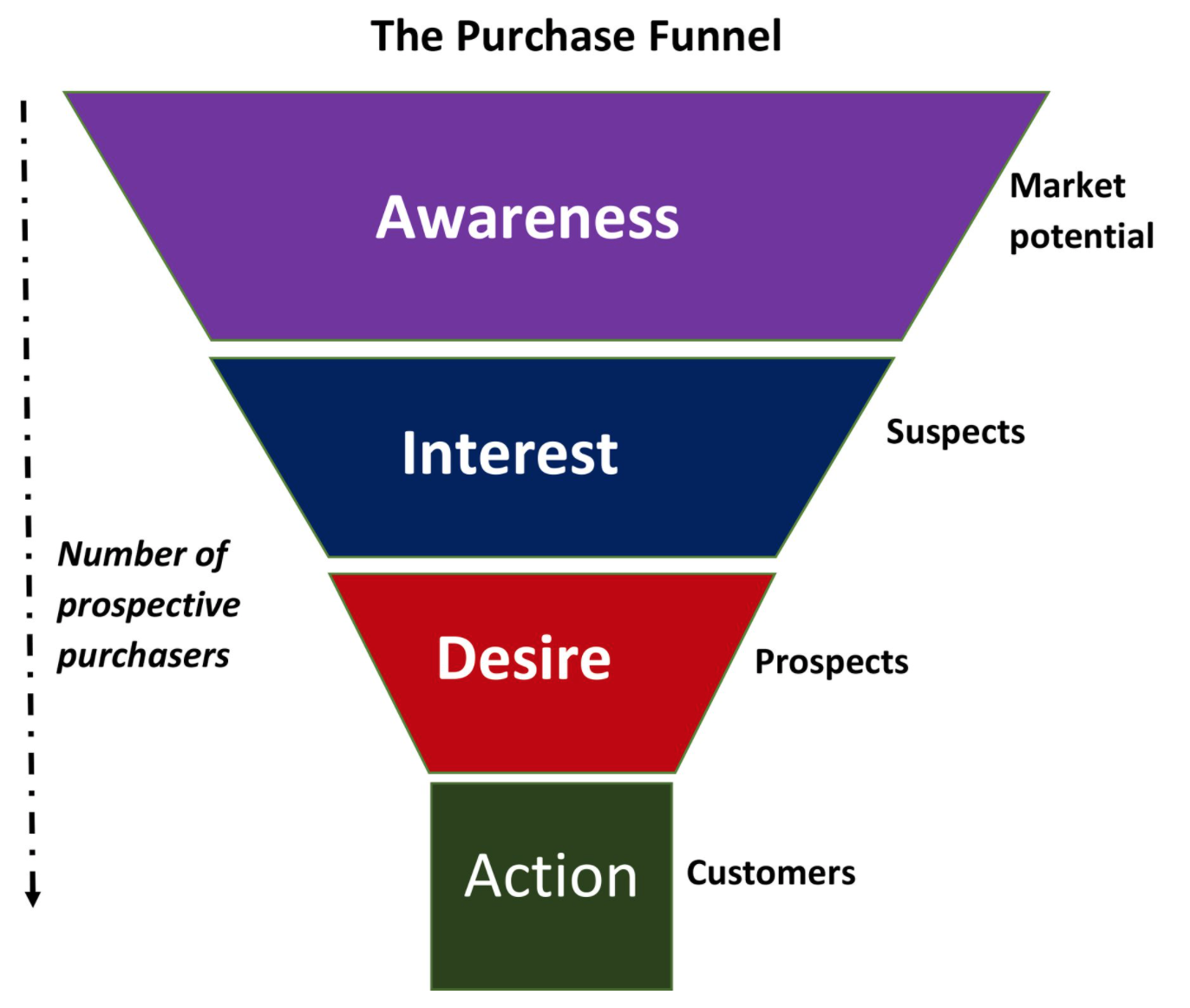 이처럼 AIDA 모델은 선형적이고 순차적 단계를 가지고 있으며 각 단계를 거치면서 고객 수는 줄어들게 된다. 이러한 현상을 구매 퍼널(The pharse funnel), 마케팅 퍼널, 또는 고객 퍼널 이라고 한다.