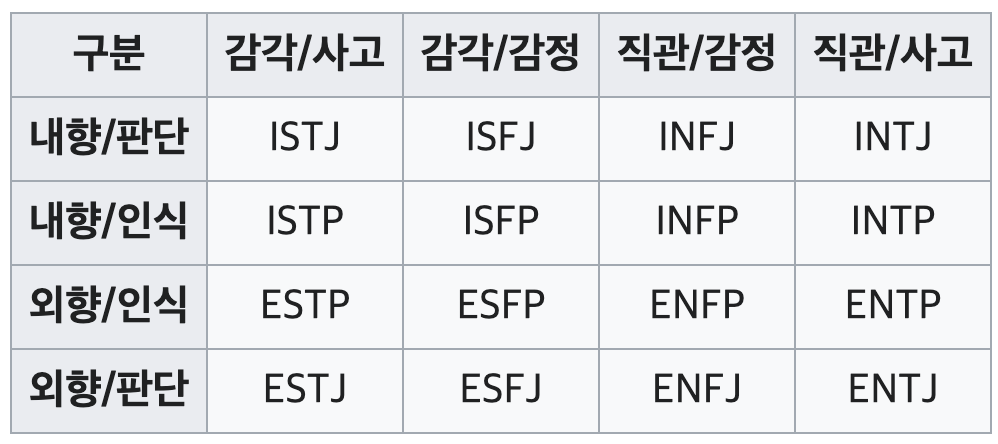 따라서, 모든 사람은 아래와 같이 총 16가지의 성격 유형 중에 하나로 구분 될 수 있다.