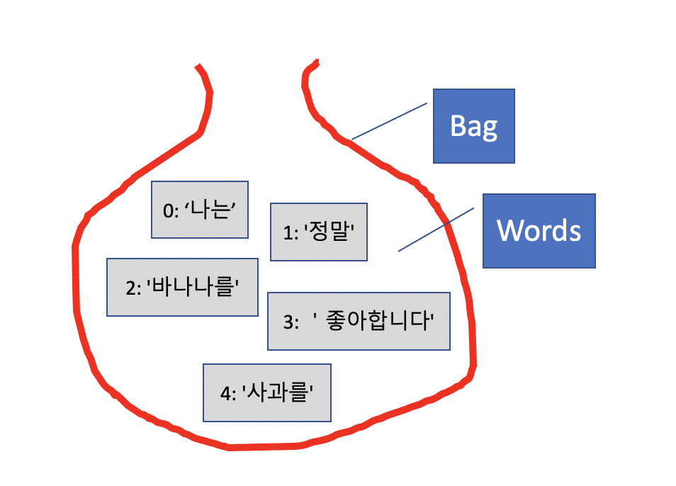 단어 가방는 단어가 중복되어 들어있지 않습니다. 그래서 각 단어에 순번을 할당하면 순번만으로도 어떤 단어인지를 알수 있습니다. 즉, 1번 카드에는 '나는'이 적혀있고, 2번카드에는 '사과를'이라고 적혀있다고 생각할 수 있습니다. 그러면 단어 가방에는 다음과 같이 들어있다고 할 수 있습니다. {0: '나는', 1: '정말', 2: '바나나를', 3: '좋아합니다', 4: '사과를'}