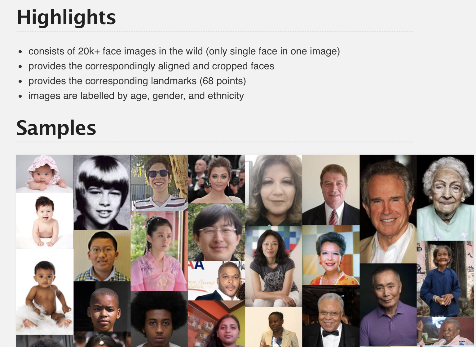 Projects: The dataset can be used on a variety of task such as facial detection, age estimation, age progression, age regression, landmark localisation, etc.