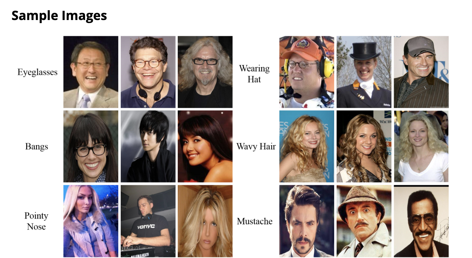 Size: The size of the dataset is 200K, which includes 10,177 number of identities, 202,599 number of face images, and 5 landmark locations, 40 binary attributes annotations per image.