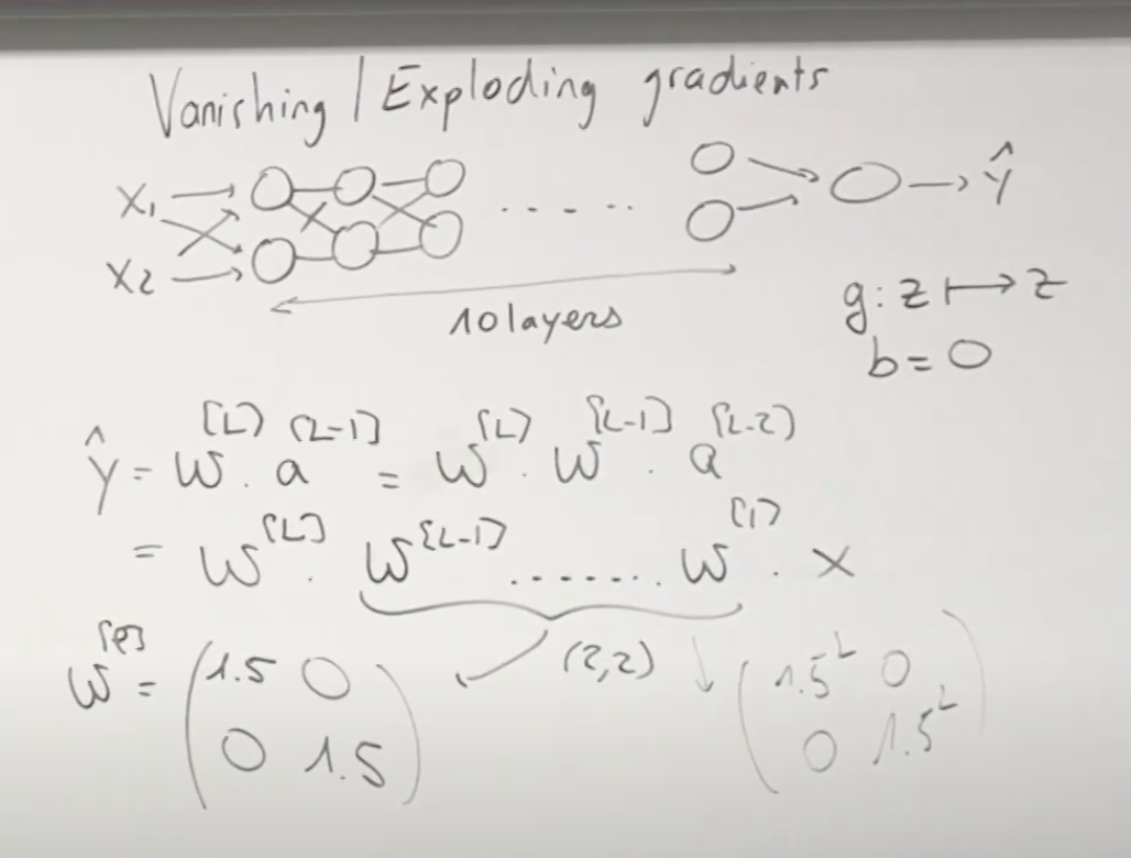 베니싱 그레디언트(Vanishing Gradient)에 대해서 좀더 자세히 알아보겠습니다. 아래와 같이 히든 레이어가 10개, 활성화 함수는 Identical 함수(그냥 통과하는 함수), 그리고 바이어스는 0인 신경망을 만들었다고 하겠습니다. 아래 계산에서도 볼 수 있듯이 w 의 값이 초기값에 L 승으로 곱한 결과가 됩니다. 따라서 초기 값이 1보다 조금만 커도 결과 값은 아주 큰 값으로 설정이 되고 1보다 작은 값을 설정을 해도 결과 값은 아주 작은 값으로 설정되게 됩니다. 0.9, 1.1 처럼 1 근처의 값으로 주면 그나마 변화량이 덜 할 것입니다. 그러나 조금만 커져도 엄청낙게 큰 값으로 바뀌고 조금만 더 작아져도 엄청나게 작은 값으로 바뀝니다. 그래서 활성화 함수가 중요합니다.