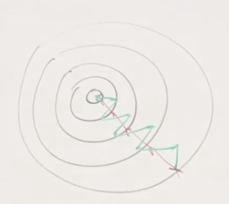 배치 그레디언트 디센트(Batch Gradient Descent) 방법을 2차원에서 그려보면 아래의 녹색 선과 같이 움직입니다. 이상적인 빨간색 경로보다는 돌아가는 것 같지만 하나의 이터레이션을 훨씬 빠르게 실행할 수 있습니다.