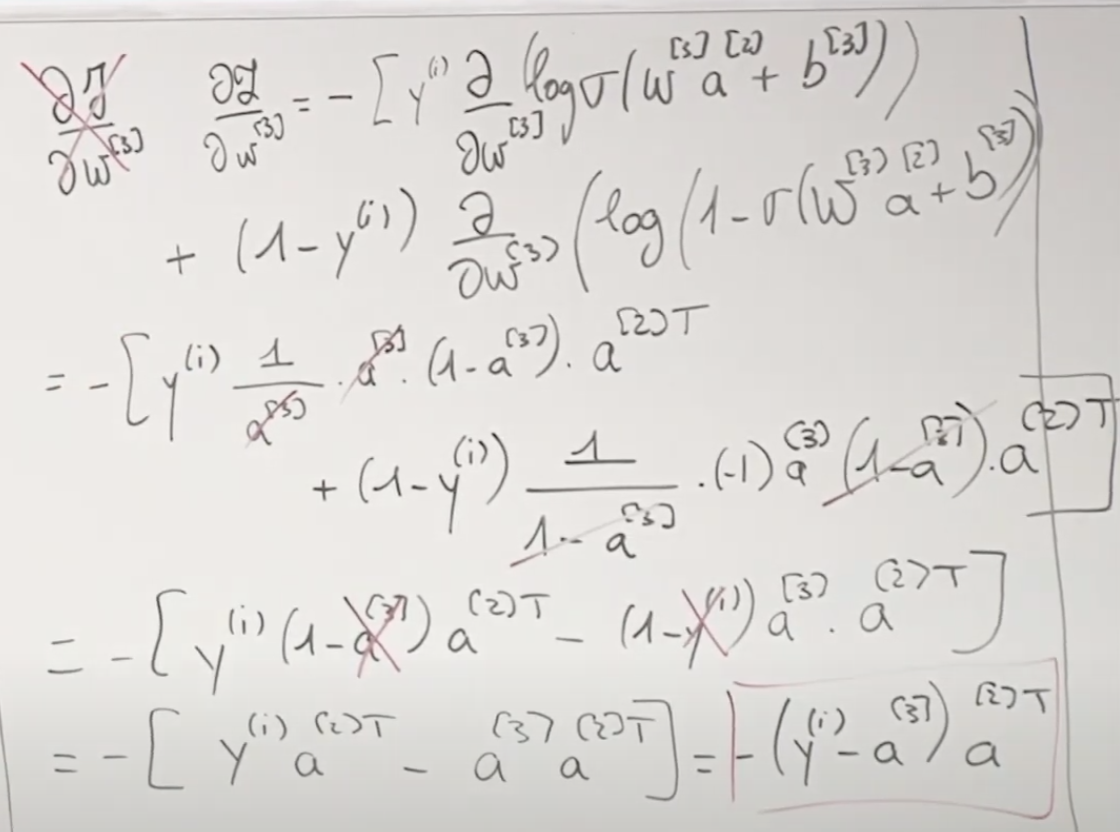 역전파, 백프로파게이션, Backprop을 해 보겠습니다. w[3]부터 계산합니다. J (Cost Function)의 값을 w[3] 값으로 미분합니다.