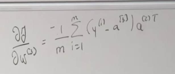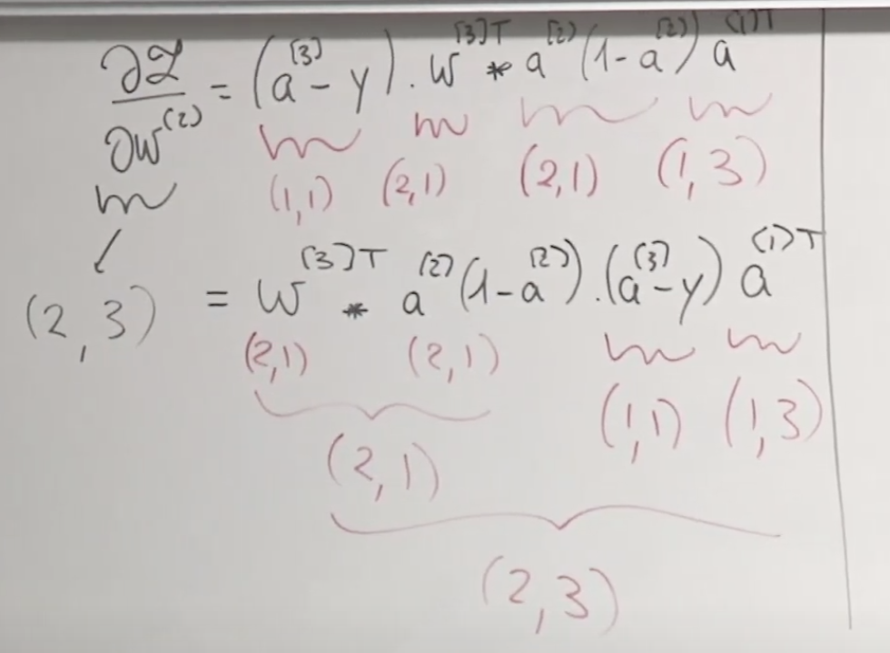 J를 w[3]로 미분하는 위에 위에 있는 이미지에서, 마지막에 a[2]에 왜 Transpose 를 할까요? 바로 행렬간의 계산을 할 수있도록 해주기 위해서 입니다. 아래에서 처럼 transpose를 해주어야 (1, 2) 행렬이 됩니다.