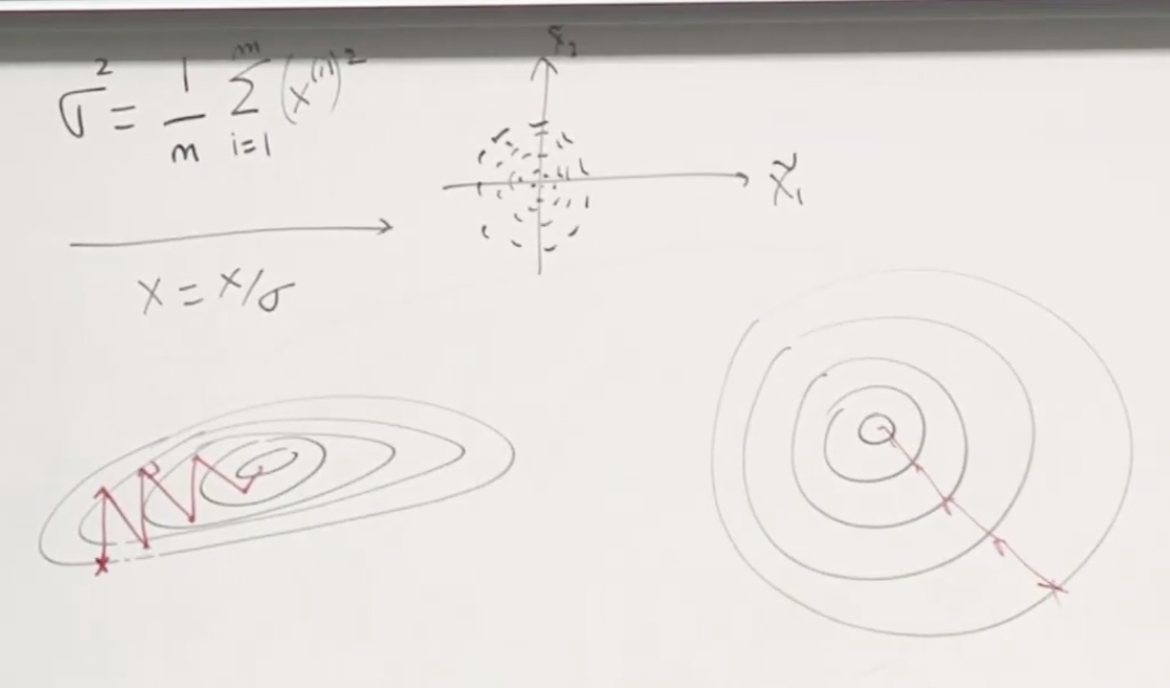 표준편차를 통해 정규한 내용이며 이럴 경우 최적값을 찾아가는 경로가 훨씬 단축되게 됩니다. 그래서 정규화를 하는 것이지요.