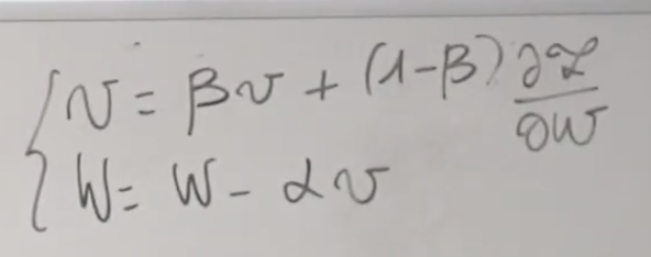 또 약간 다른 Gradient Descent와 Momentum(모멘텀) 알고리즘을 소개합니다. 일반적으로 GD를 쓰면 빨간색 선과 같이 움직이면서 최적값을 찾아가는데, 여기에 모멘텀을 더하면 녹색 선과 같이 움직이게 됩니다. GD는 지나온 과거의 움직임을 고려하지 않고 앞으로 나아 갑니다. 반면에 모멘텀은 과거 움직임을 고려해서 앞으로의 방향을 조정합니다. 처음 시작점에서 두번째 점으로 이동했을때 가로, 세로의 변화량을 보면 세로의 변화량은 큰데 가로의 변화량은 작습니다. 이것을 눈치첸 모멘텀은 가로를 더 많이 가게 조정해서 녹색 선의 세번째 점을 향하게 됩니다. 이런 방법으로 학습하면 훨씬 더 빠르게 최적화를 할 수 있습니다.