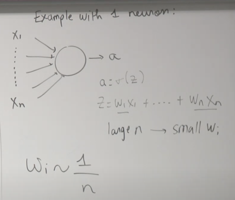 하나의 뉴런을 가지고 예를 들어보겠습니다. 보시는 것처럼 n이 커지면 w(i)가 작아집니다. 따라서 w(가중치)의 초기 값을 1/n으로 설정하는 것도 좋은 가중치 초기화 방법 중에 하나 입니다.