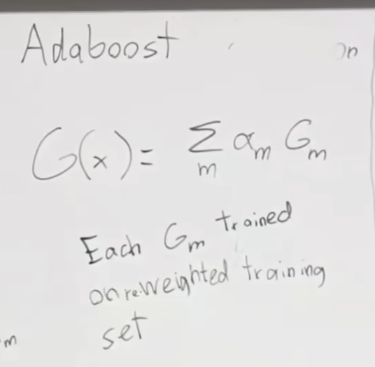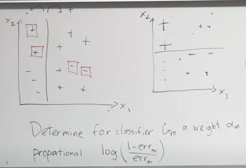부스팅은 배깅과 다르게 바이어스를 줄이는 효과가 있습니다. 변수 사이의 상효작용에 강합니다. 이 기술은 반복적인 모델 훈련을 합니다. x1, x2 피처를 가지고 분류 모델을 만든 다고 가정해 보시죠. 아래 왼쪽과 같이 분류모델을 만들어 분류를 할 수 있는데 빨간색 박스 처럼 오분류하는 경우가 발생합니다. 이러한 경우 다음 훈련에서 해당 예제 샘플의 가중치를 높혀서 훈련하면 오른쪽의 그림처럼 큰 +와 -를 만들수 있고 이들을 고려한 분류모델을 만들면 그림과 같이 위/아래로 나누는 분류선(모델)을 만들 수 있습니다. 이런 식으로 반복해 나가면서 모델을 학습하는 방법이 부스팅 입니다.