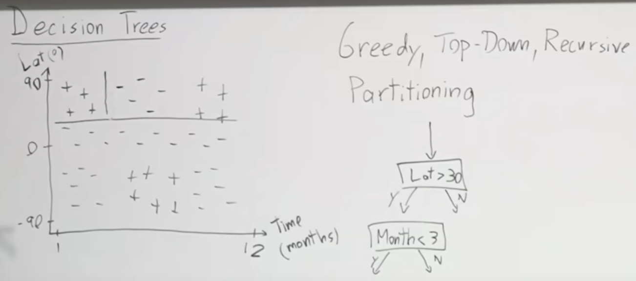 첫번째는 위도가 30도 인지를 가지고 분류할 수 있습니다. 그래서 위도가 30보다 큰 지역과 작은 지역으로 나누어 집니다. 이어서 두번째로는 시간(월)을 가지고 분류할 수 있습니다. 3월보다 작은 달인지 아니닌지로 구분합니다. 이렇게 나누어진 그림이 아래와 같습니다.