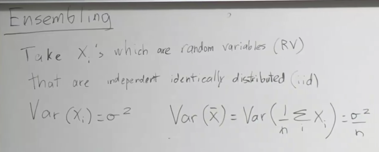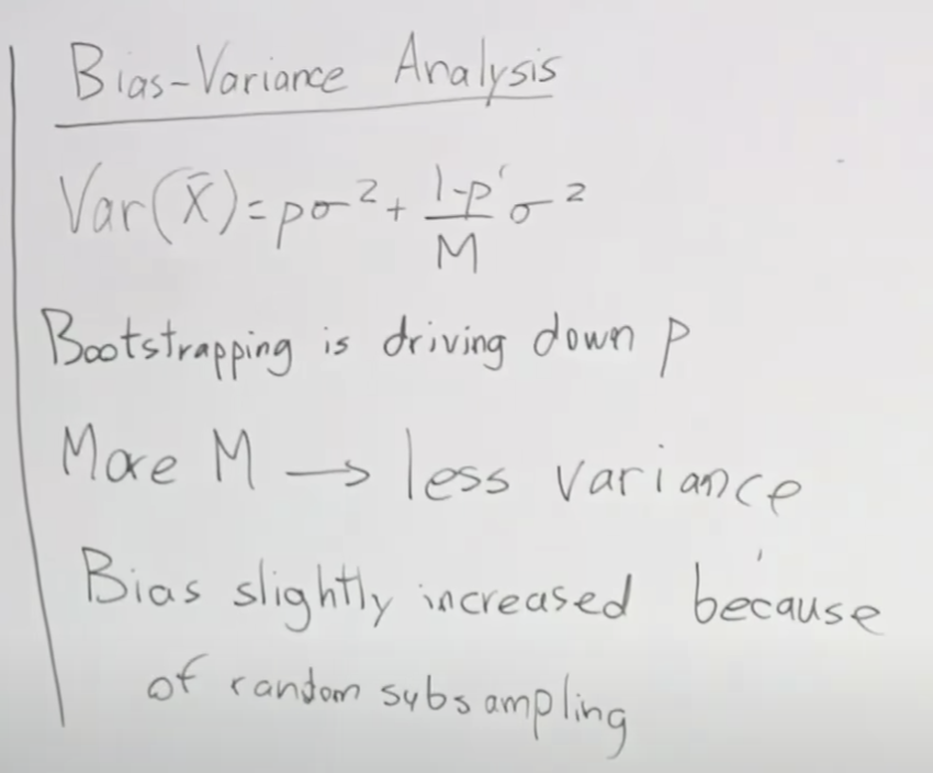 이 기술을 적용하면 바이어스와 베리언스(오차와 분산, Bias-Variance)에 변화를 주게 됩니다. 앞서 분산에 대한 공식을 정리한 것이 있는데 이것을 부스팅에 적용하면 아래와 같습니다. 즉, Var(x-)의 내용중 분모를 M (샘플z 수)로 바꾸어 준것 밖에 없습니다. 부스팅을 적용하면 공식에 있는 p를 줄입니다. 그리고 데이터가 많을 수록 분산을 줄입니다. 반면 오차는 살짝 올라 갈 수 있습니다.