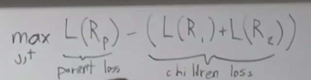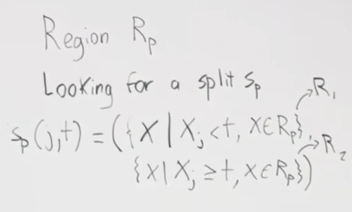 아래는 p(positive, +) 지역(Region Rp)을 찾는 것을 함수 Sp로 만들었을때의 공식입니다. 입력 변수로 j는 피처를 나타내고 t는 임계값을 의미합니다. Rp는 Region parent 즉, 상위/부모의 지역을 말합니다. 아래 공식을 설명해보면 j 에 해당하는 Xj 값이 임계값 t 보다 작을 때는 첫번째 지역 R1에 할당하고, 크거나 같을 경우 두번째 지역 R2에 할당합니다.