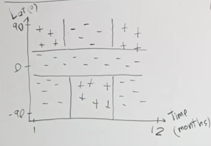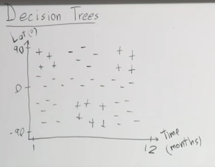 시간(월)과 위도를 가지고 스키를 타기 좋은지 아닌지를 구분하는 분류기를 만든다고 생각해 봅시다. 데이터를 통해 가능한 지역과 시간에 +를 표시하고 불가능한 지역과 시간에 -를 표시하면 아래와 같습니다.