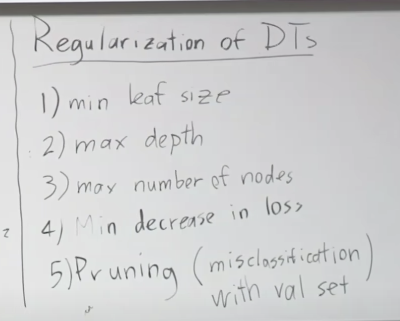트리 모델을 모든 훈련데이터에 훈련 시키면 결국 모든 훈련케이스를 만족시키는 트리를 만들게 되어 결국 최종 결과가 하나씩 연결되는 Overfitting이 발생하게됩니다. 이를 방지하기위해 정규화가 필요한데 여기에 사용되는 다양한 휴리스틱 정규화 방법에 대해서 알아보면 아래와 같습니다. 최소 리프 사이즈를 제한 하거나, 트리의 깊이를 제한 하거나, 노드들의 최대 수를 정해 놓거나, 최소로 줄어드는 로스를 정해 놓거나, 검증 데이터에서 잘못 분류된 가지를 제거하는 등이 있습니다. 특히, min decrease in loss의 경우 부모노드 보다 자식노드가 최소 어느정도는 더 분류를 잘해야 하는 지를 정하는 방법으로, 데이터 피처의 중요도-잘 분류하는 데이터 피처에 따라서 위에서 아래로 정리되게 만드는 방법입니다.