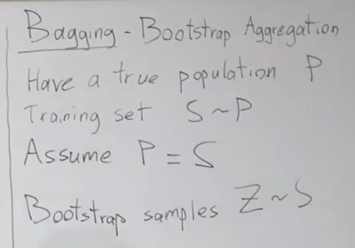 베깅에 대해서 알아보면 다음과 같습니다. 배깅은 부트스트랩 에그리게이션(Bootstrap Aggregation)의 축약어 입니다. 실제 모집단 P에서 샘플 S를 뽑아서 훈련 셋을 사용합니다. 이때 우리는 샘플이 모집단과 같다고 가정하고 모델을 만듭니다. 여기에 부트스트랩이라는 기술을 추가하는데 이것은 샘플에서 다시 샘플을 추출하여 Z라는 샘플을 만들고 이것을 훈련에 이용하는 것을 말합니다.