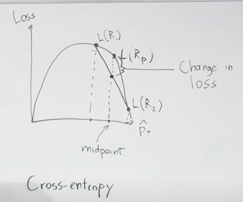 크로스 엔트로피 로스는 L(R1)과 L(R2)의 평균에 해당하는 지점에서 곡선과 직각이되는 점-L(Rp)와의 차이(Gain)를 계산하는 것 입니다. 아래에서 Change in loss로 적혀 있는 부분이 Gain입니다. 즉, 부모 노드에서 발생한 로스 보다 자식 노드 2개에서 발생한 로스의 평균이 더 적게 되는 경우 입니다.