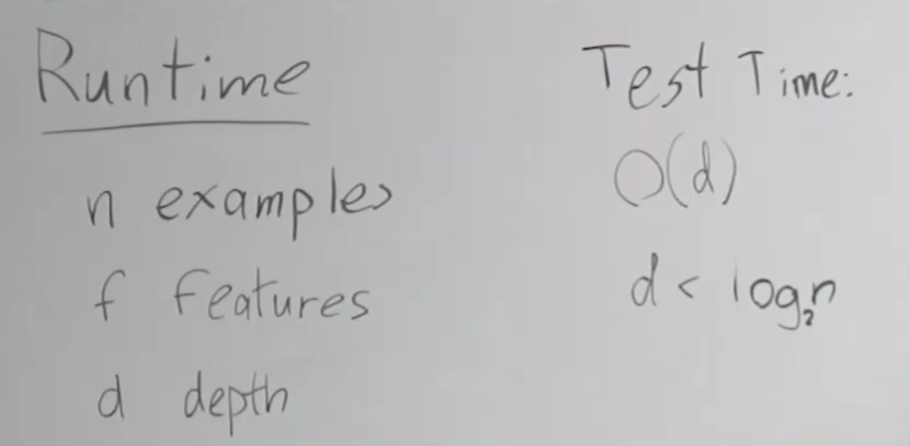 n은 예제수, f는 피처수, d를 나무의 깊이라고 하면, 테스트 시간은 O(d)가 되고 이때 깊이 d는 log2n 보다 작습니다. 여기서 log2n이 의미하는 것은 말 그대로 훈련 예제수에 로그를 취한 값 입니다. 다시 말하면 전체 예제수로 훈련해서 만들어진 훈련된 트리를 이용해서 테스트를 하게 되기 때문에 훈련에서 만들어진 트리의 깊이에 따라 속도가 달라지게되고 이 깊이는 훈련을 통해 잘 분리되도록 하는 이진트리(하위노드가 2개인 트리)를 만들었다고 할경우 결국 훈련데이터의 예제수에 로그를 취한 값이 보다 작아지게 됩니다. 리프 노드에 하나의 예제가 달린다고 최학의 경우를 가정한 것이 log2n입니다. 아무튼 너무 당연한 이야기 인데요 트리의 예측 속도는 트리의 깊이 만큼 비교해야하기 때문에 O(d)입니다.
