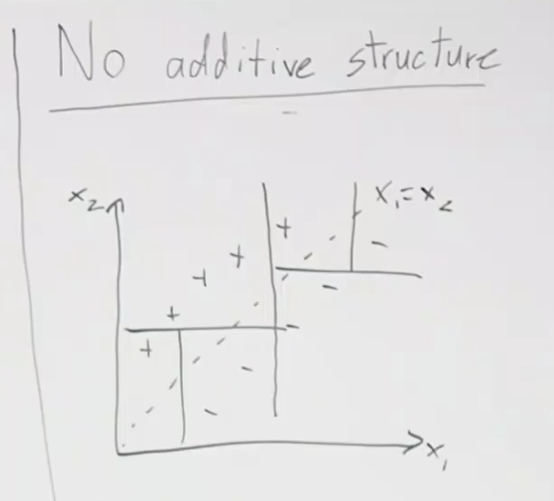 이제 의사결정트리의 단점을 알아볼까요? 선형회귀로 간단히 분류가 가능한 +와 - 데이터 들이 있습니다. 그런데 이것을 의사결정나무 Decision Trees로 분류하게 되면 많은 분류 기준이 필요하여 복잡한 트리가 만들어 질 수 있습니다. 속도도 느려지고 잘 분류가 안되는 경우도 생길 수 있습니다.