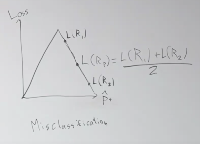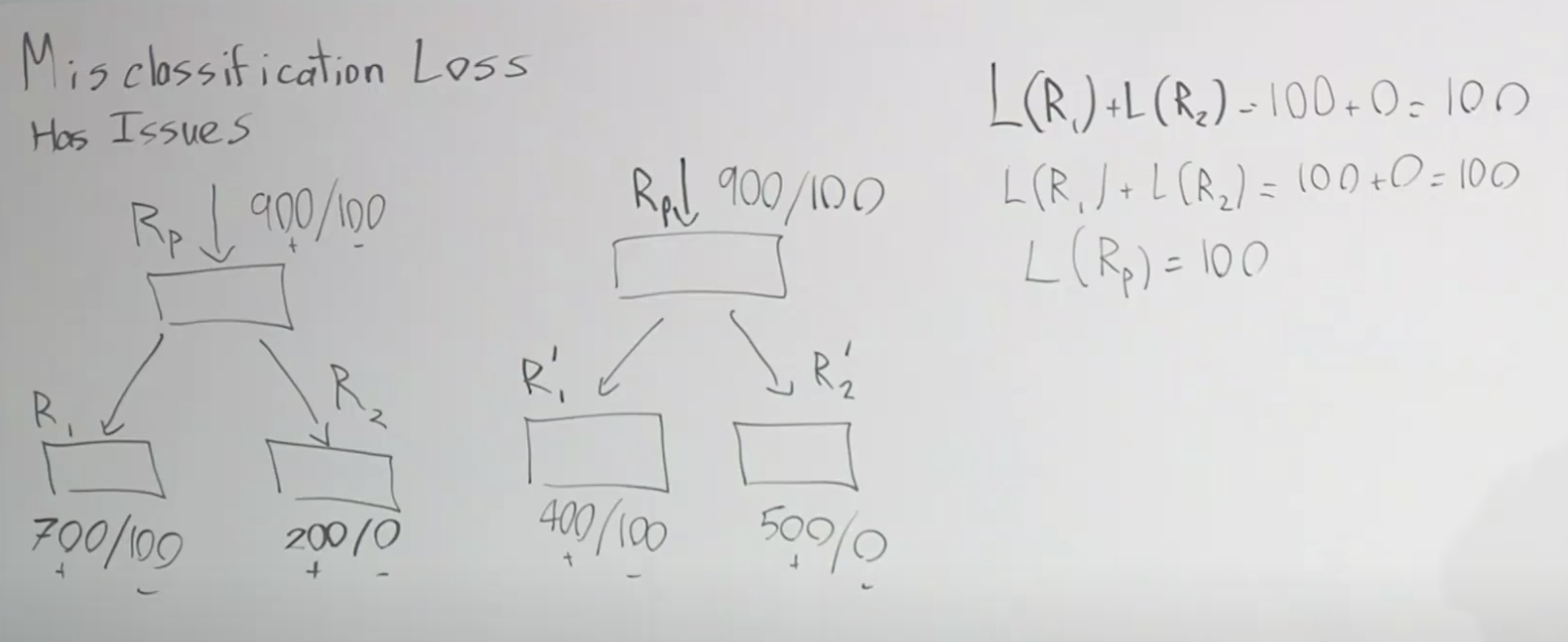아래는 잘 못 분류된 경우를 설명하는 그림입니다. 부모 노드의 로스(L(Rp))가 결국 자식 노드 2개의 평균과 같은 것이 되버리기 때문에 자식 도드에서는 의미 없는 분류를 한 것과 같습니다.