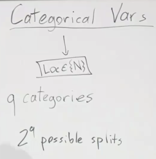 Categorical Vars 를 가지고도 모델을 만들 수 있습니다. 그러나 9개의 카테고리가 있다고 만 가정해도 2^9만큼의 분리가능한 것들이 생겨서 너무 복잡하고 비효율적입니다.