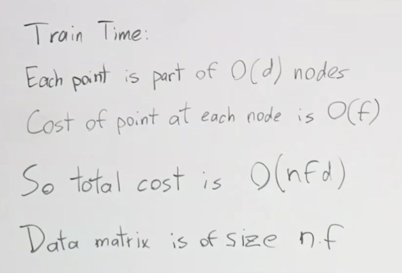 그럼 훈련 시간은 어떻게 될까요? 각 포인트는 O(n) 속도의 노드에 속한 한 부분이고, 각 노드에서 포인트의 비용은 O(f)입니다. 이 말은 피처 f가 위도, 시간-월 이렇게 2개있을 경우 O(2) 만큼의 시간이 걸린다는 말입니다. 깊이 마다, 각 노드에서 피처마다 처리하는 시간이 필요하고 이런 계산을 예제수 만큼해야하니 모두 곱한 O(nfd)가 훈련 시간이 됩니다.