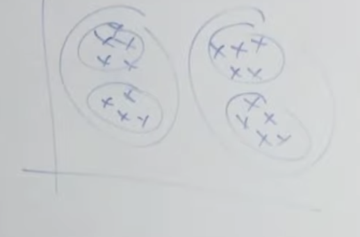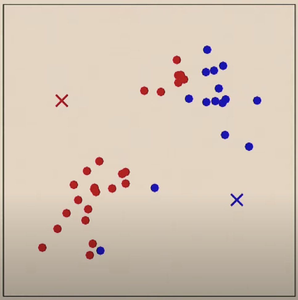 위와 같은 데이터 셋이 제공되면 2개의 그룹으로 클러스터링 하기를 원할 것입니다. k-means의 경우 임의로 클러스터 갯수에 해당하는 위치를 선정하고