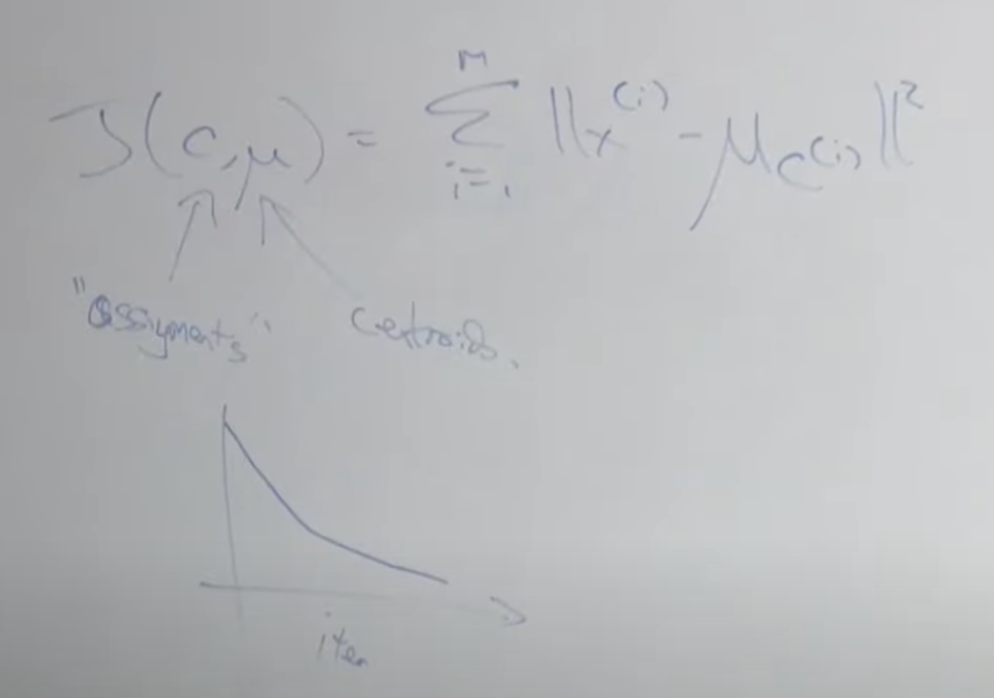비용함수를 공식으로 적어보면 아래와 같습니다. c는 각 점들을 의미하고, u 뮤는 중심점을 의미 합니다. 각 x 값과 중심점과의 차이를 모두 더한 값으로 반복할 수록 작은 값으로 수렴하게 됩니다. 아주 많은 데이터를 가지고 이 알고리즘을 돌리다보면 아래의 그래프 처럼 수렴하기 전에라도 어느 정도 중심점이 변하지 않으면 종료하기도 합니다.