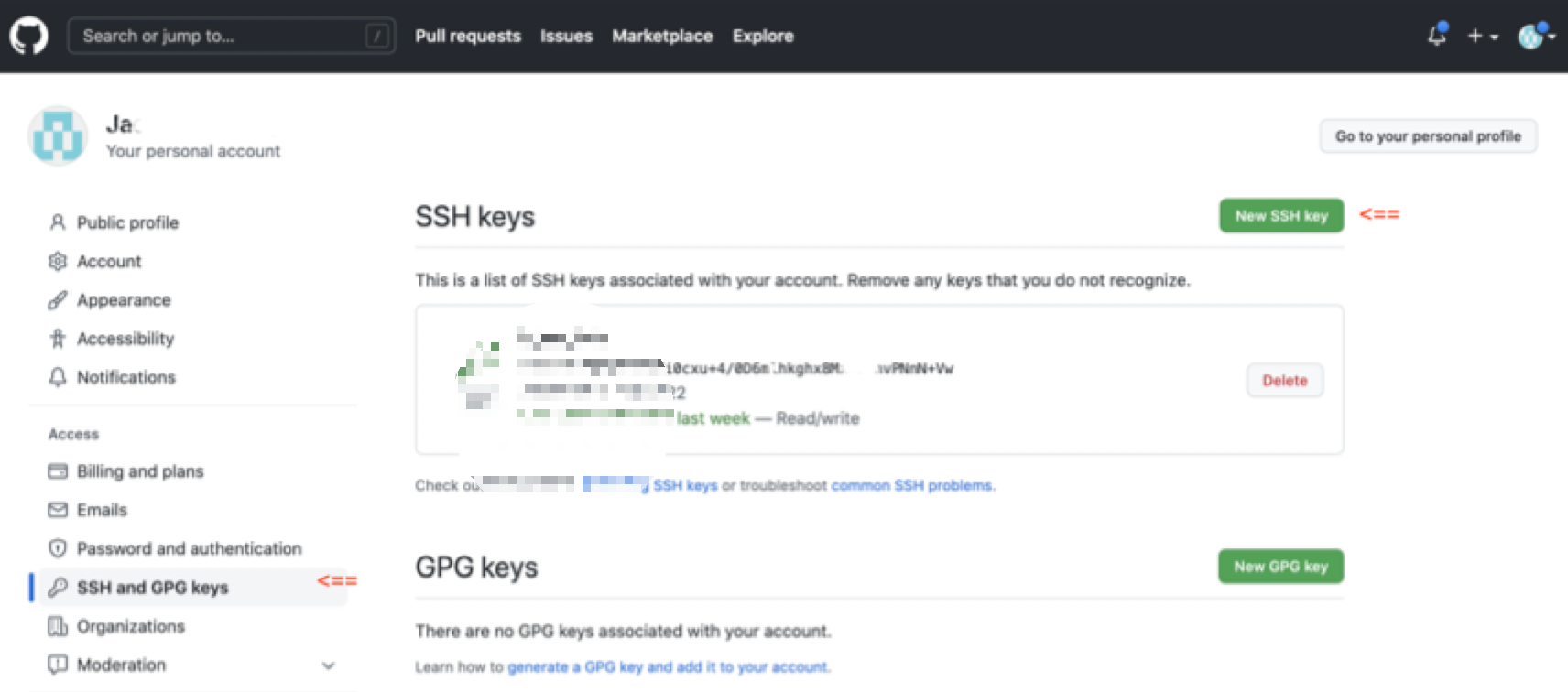 git hub에 로그인한 뒤 메뉴를 찾아갑니다. 사용자 아이콘 클릭 -> 설정(Settings) -> access(SSH and GPG keys) 클릭 후 New SSH key 버튼(아래 이미지 내 <==)를 클릭 합니다.
