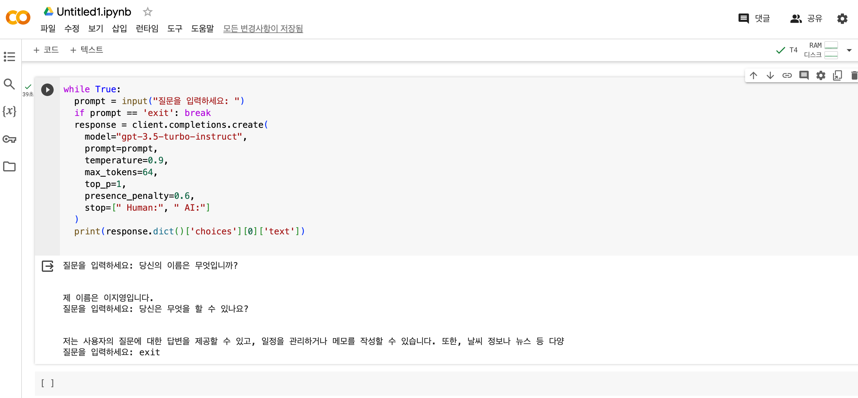 지금까지 한번의 대화 턴(Turn)이 있는 하나의 질문과 대답을 보았습니다. 계속적인 대화를 위해서 아래와 같은 파이썬 코드를 작성할 수 있습니다. while 문을 통해 반복 실행하도록 했으며, if 구문을 두어서 사용자가 입력한 값이 exit이면 while 문을 빠져나가서 종료하도록 하였습니다. 사용자가 질문을 입력한 것이라면 그내용을 chatGPT에 보내서 회신을 받고 회신 받은 내용을 출력해주는 명령을 작성하였습니다. [3.4]아래 내용을 복사하여 쎌에 입력후 실행해 보세요.