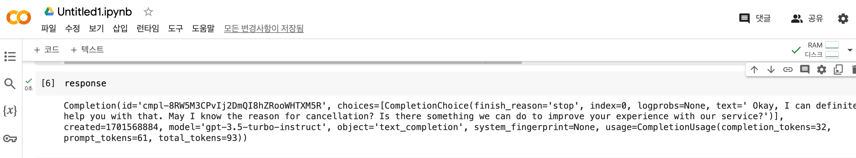 이 코드를 실행 시키면 prompt 내용이 chatGPT 모델에 전달되고 회신 받은 내용이 response에 저장됩니다. 전달자 중에 prompt의 내용을 한글로 변환하면 다음과 같습니다. "이어지는 내용은 AI 어시스턴트와의 대화입니다. 어시스턴트는 도움이되고, 창의적이고, 영리하며 매우 친절합니다. 사람: 안녕, 너는 누구니? AI: 나는 OpenAI에서 만든 AI입니다. 어떻게 도와드릴까요? 사람: 나는 가입을 취소하고 싶어 AI: " 그럼이제 반환된 response 내용을 살펴 볼까요! 아래와 같이 [3.2]쎌에 response 를 입력하고 실행합니다.