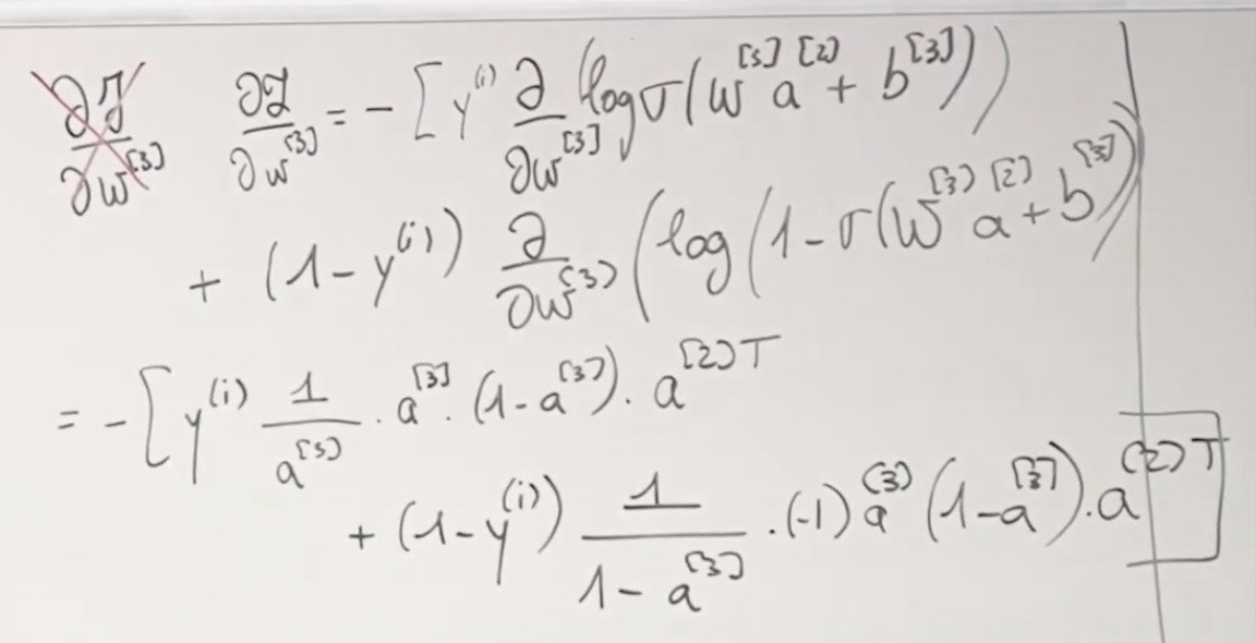 역전파, 백프로파게이션, Backprop을 해 보겠습니다. w[3]부터 계산합니다. J (Cost Function)의 값을 w[3] 값으로 미분합니다.