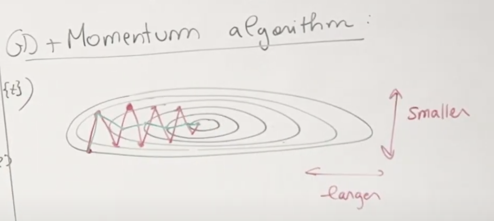 또 약간 다른 Gradient Descent와 Momentum(모멘텀) 알고리즘을 소개합니다. 일반적으로 GD를 쓰면 빨간색 선과 같이 움직이면서 최적값을 찾아가는데, 여기에 모멘텀을 더하면 녹색 선과 같이 움직이게 됩니다. GD는 지나온 과거의 움직임을 고려하지 않고 앞으로 나아 갑니다. 반면에 모멘텀은 과거 움직임을 고려해서 앞으로의 방향을 조정합니다. 처음 시작점에서 두번째 점으로 이동했을때 가로, 세로의 변화량을 보면 세로의 변화량은 큰데 가로의 변화량은 작습니다. 이것을 눈치첸 모멘텀은 가로를 더 많이 가게 조정해서 녹색 선의 세번째 점을 향하게 됩니다. 이런 방법으로 학습하면 훨씬 더 빠르게 최적화를 할 수 있습니다.