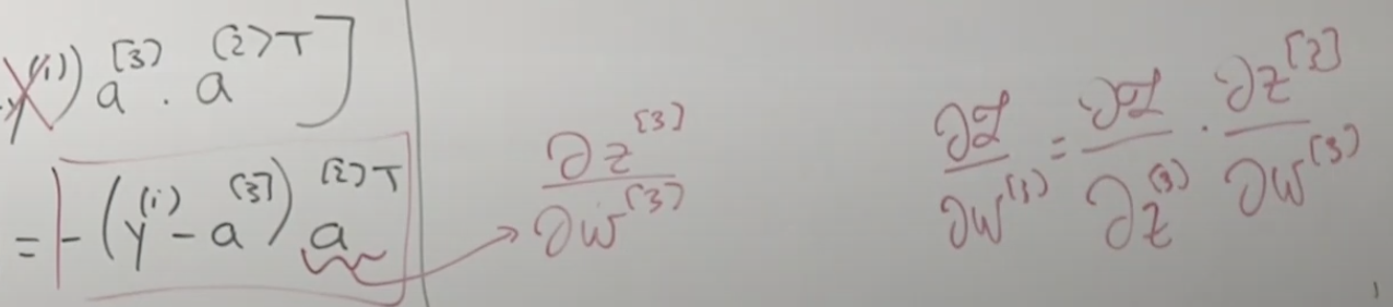 로스 함수를 w[3]로 미분한다는 것은 아래의 오른쪽 내용 처럼 분리가 가능한데요.. 이 내용을 자세히 보면 이전에 구했던 왼쪽의 내용에서 변형할 수 있는 값을 유추할 수 있습니다. 바로 a[2]T가 z[3]를 w[3]로 미분한 것과 같다는 것 입니다.