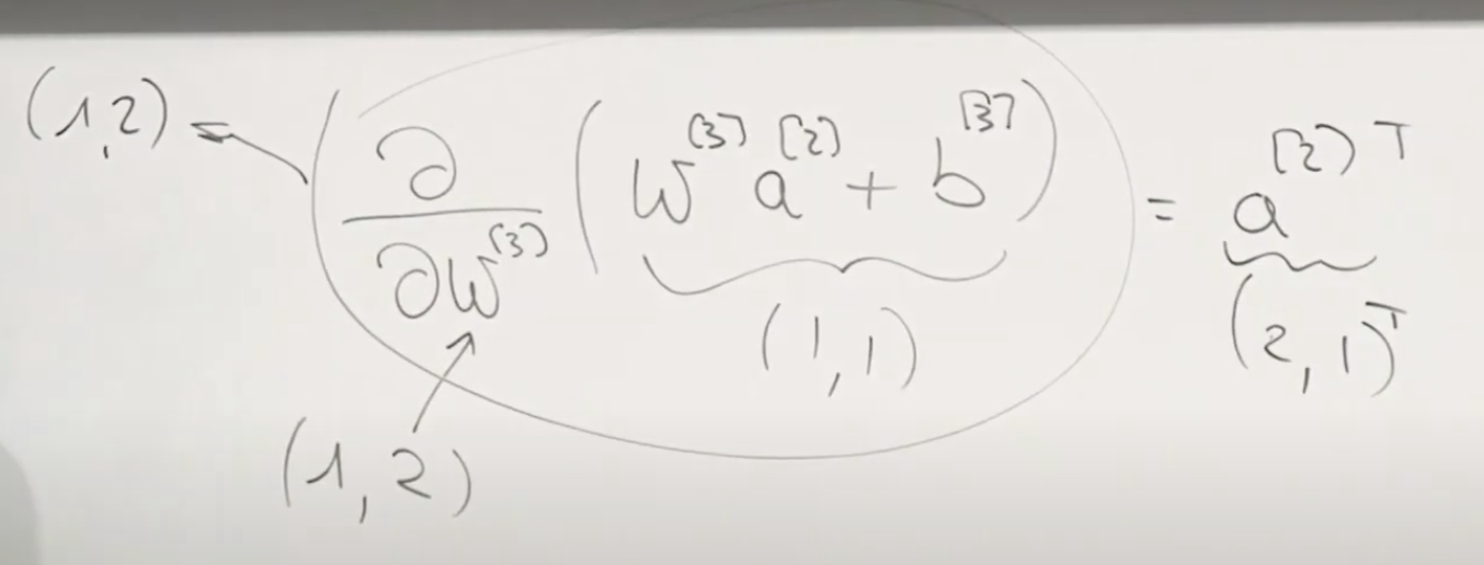 J를 w[3]로 미분하는 위에 위에 있는 이미지에서, 마지막에 a[2]에 왜 Transpose 를 할까요? 바로 행렬간의 계산을 할 수있도록 해주기 위해서 입니다. 아래에서 처럼 transpose를 해주어야 (1, 2) 행렬이 됩니다.