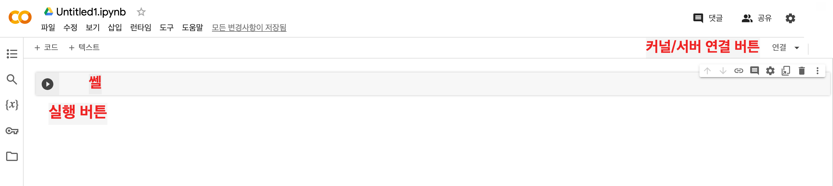 실행 시키고자하는 프로그램이 작성된 쎌을 선택하고 Shift와 Enter를 같이 누르면 쎌의 내용이 실행됩니다. 또는 쎌의 왼쪽에 보이는 삼각형 버튼을 클릭하면 코드나 텍스트를 입력할 수 있습니다.